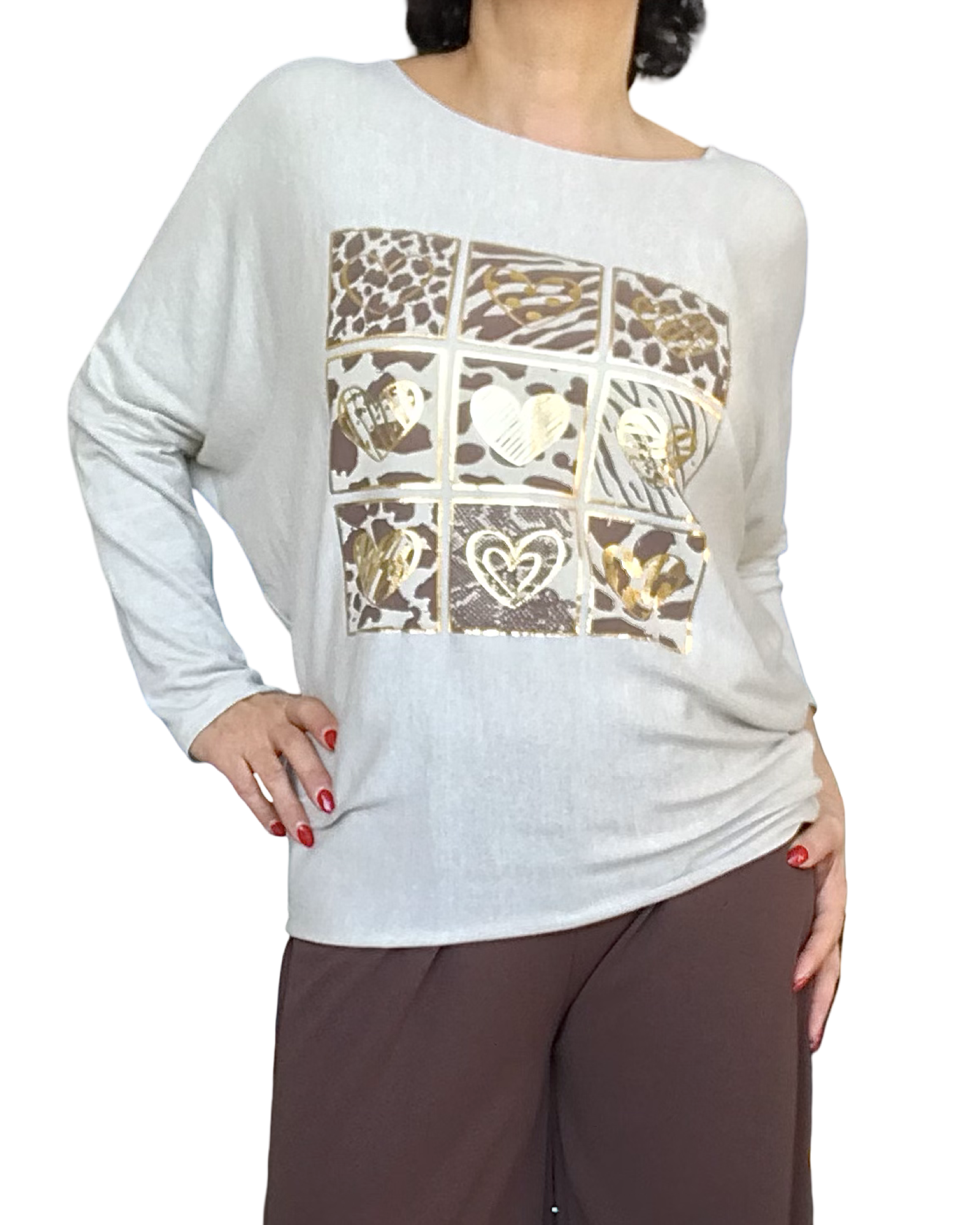 Chandail en tricot uni beige avec dessin de cœurs dorés, manche longue chauve souris