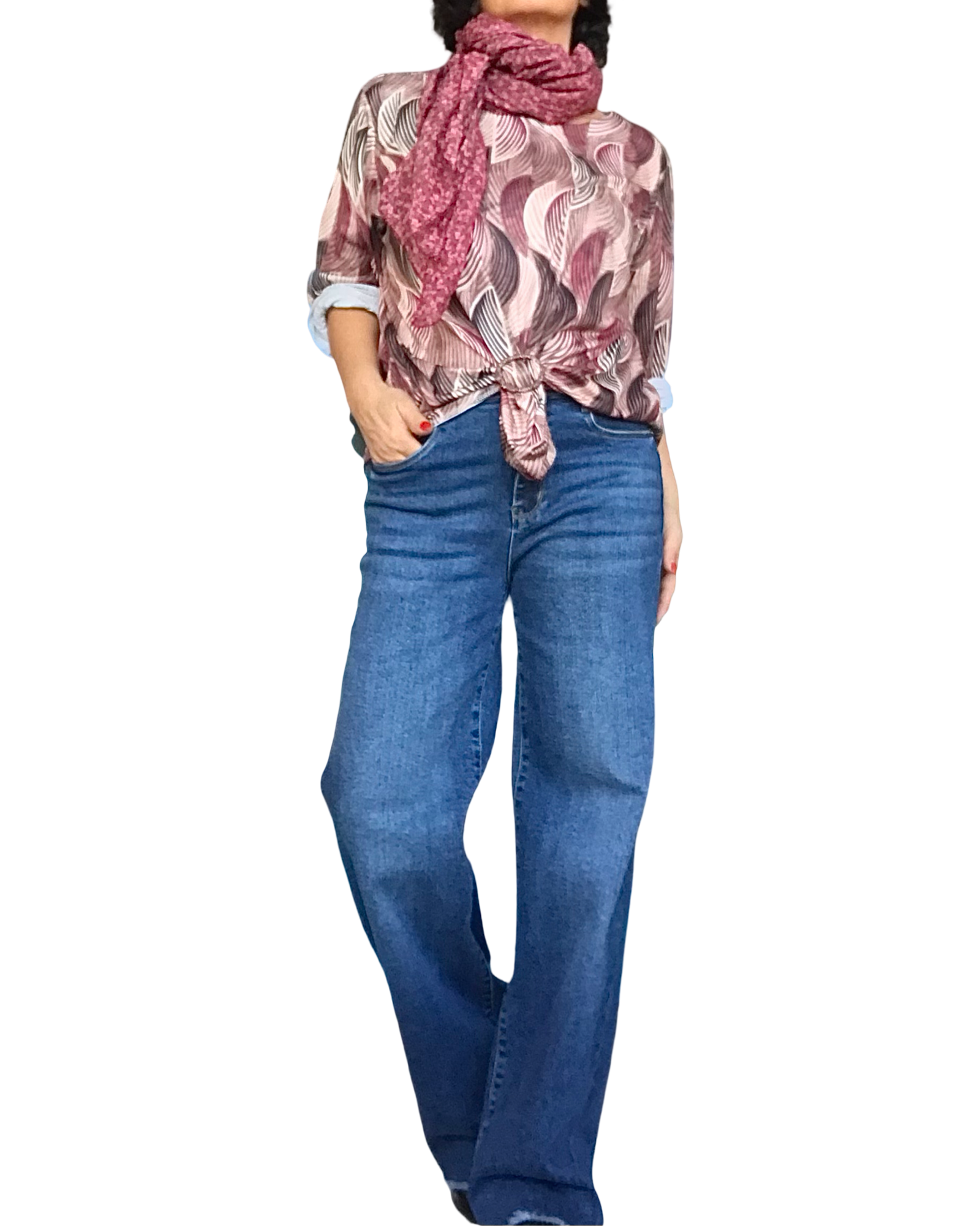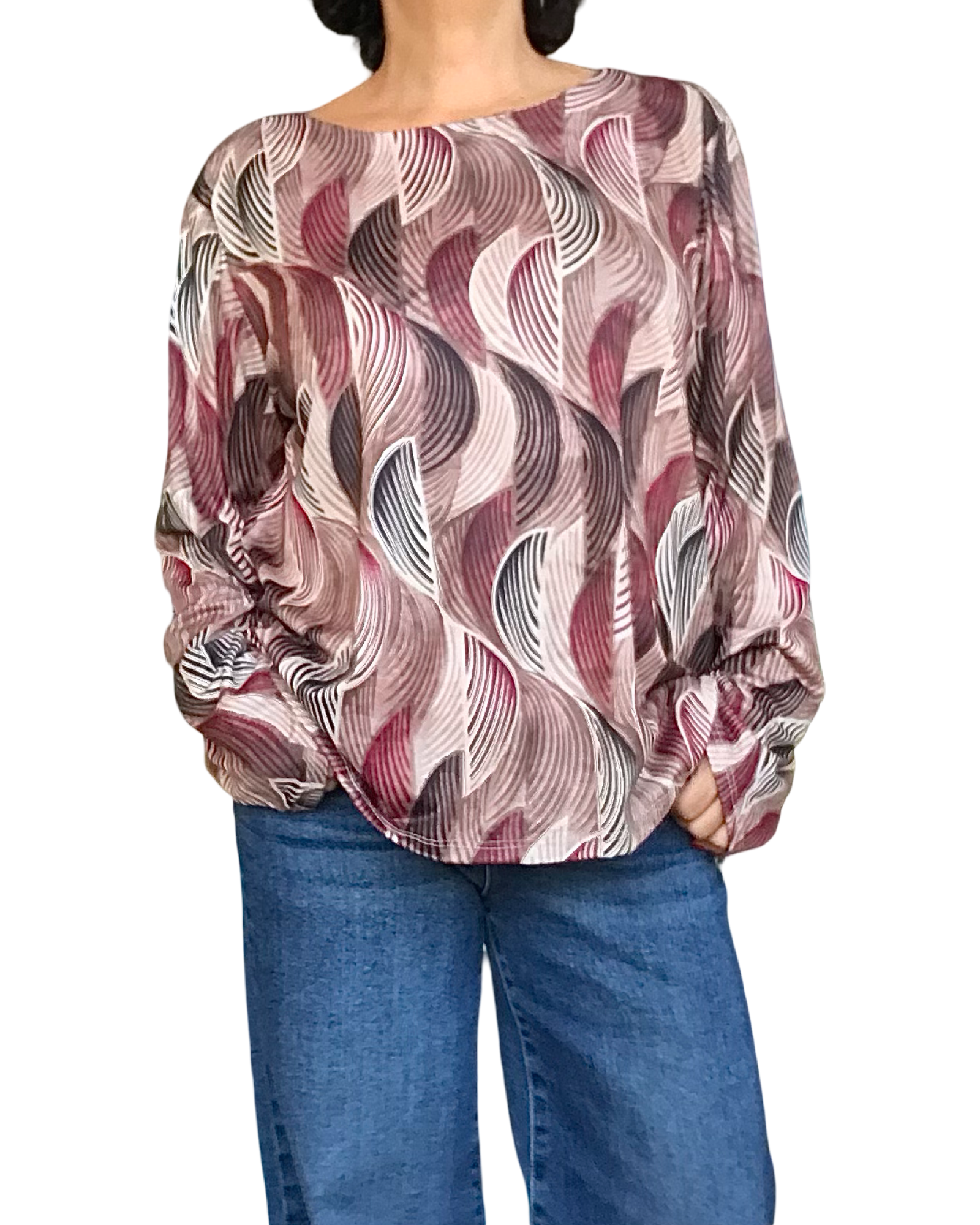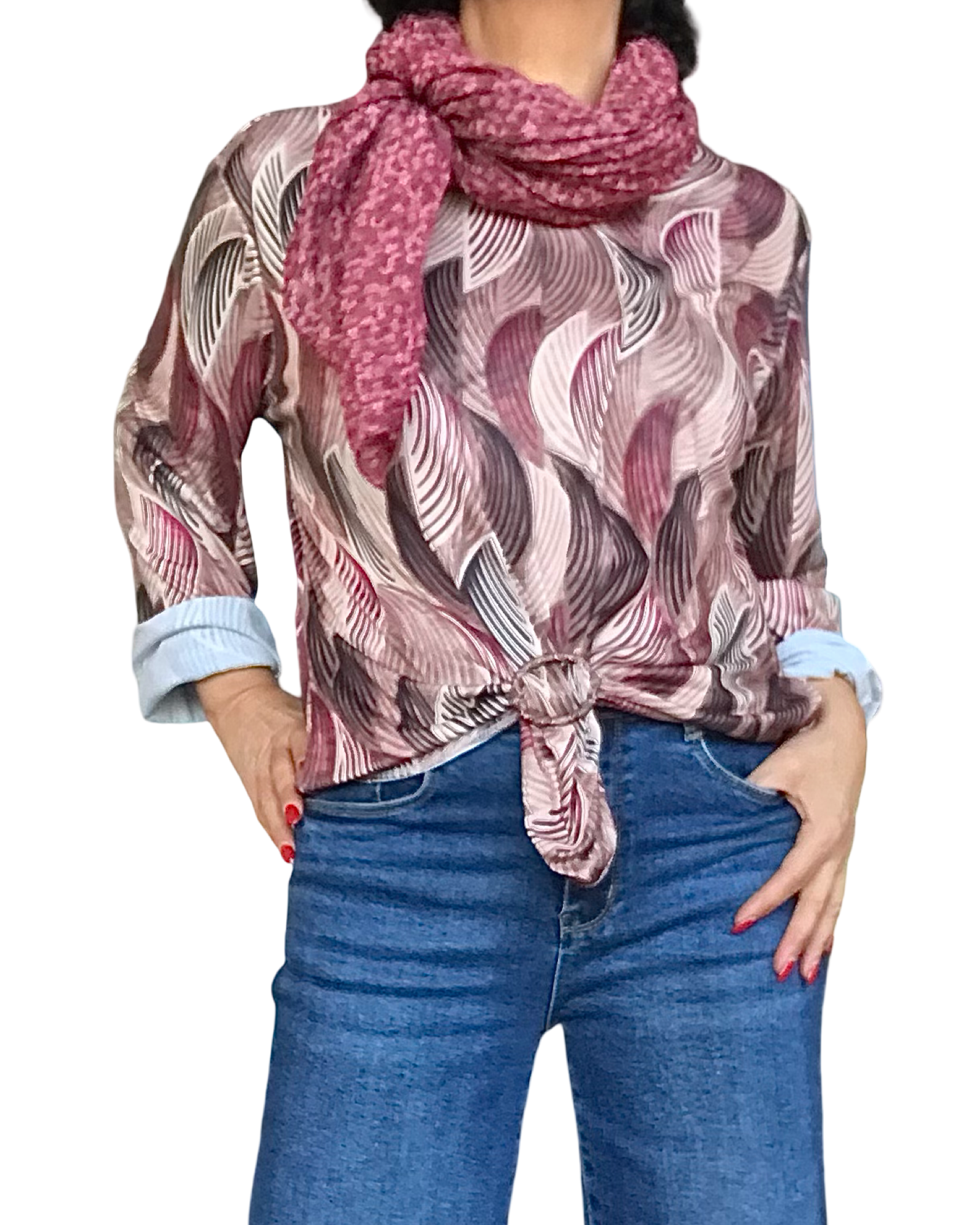 Découvrez le chandail manche longue à motifs de demi-cercles bourgogne, moka et noir 🍷, très léger et féminin ! Imprimé recherché sophistiqué ✨. Tissu doux et confortable, manches longues élégantes. Polyvalent et raffiné au quotidien ! 💫