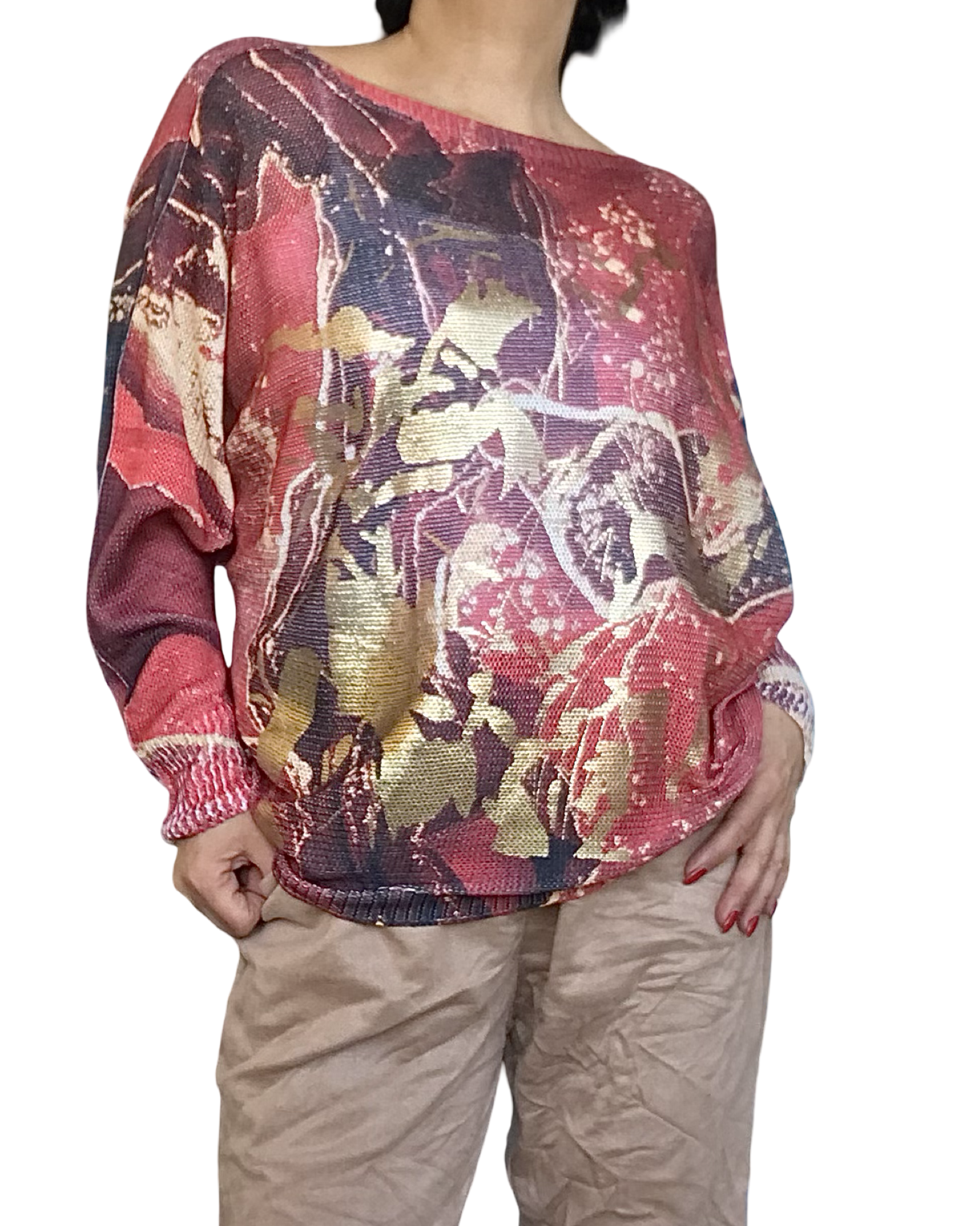 Chandail en tricot léger rouge, bourgogne et beige imprimé abstrait – Description du produit