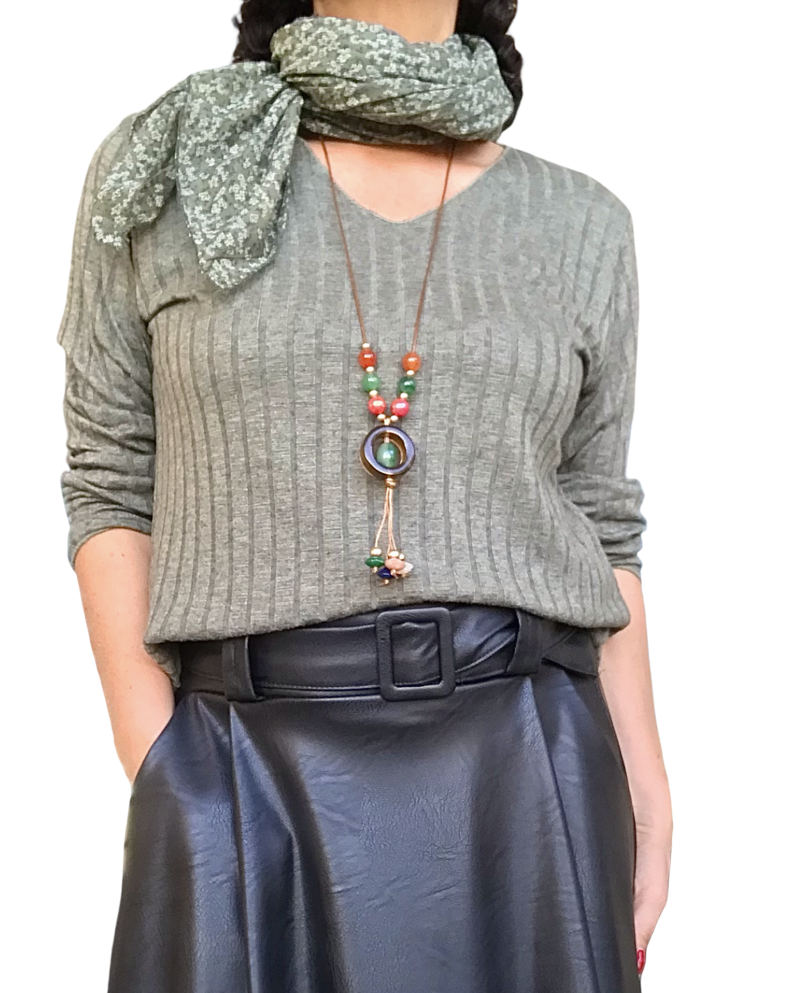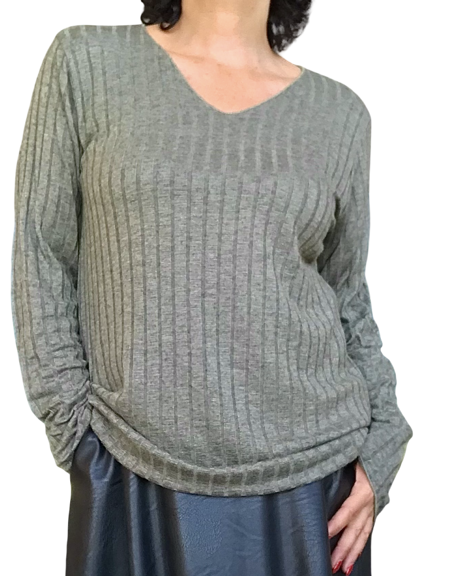 Chandail uni kaki en rib col en V manche longue – Description du produit