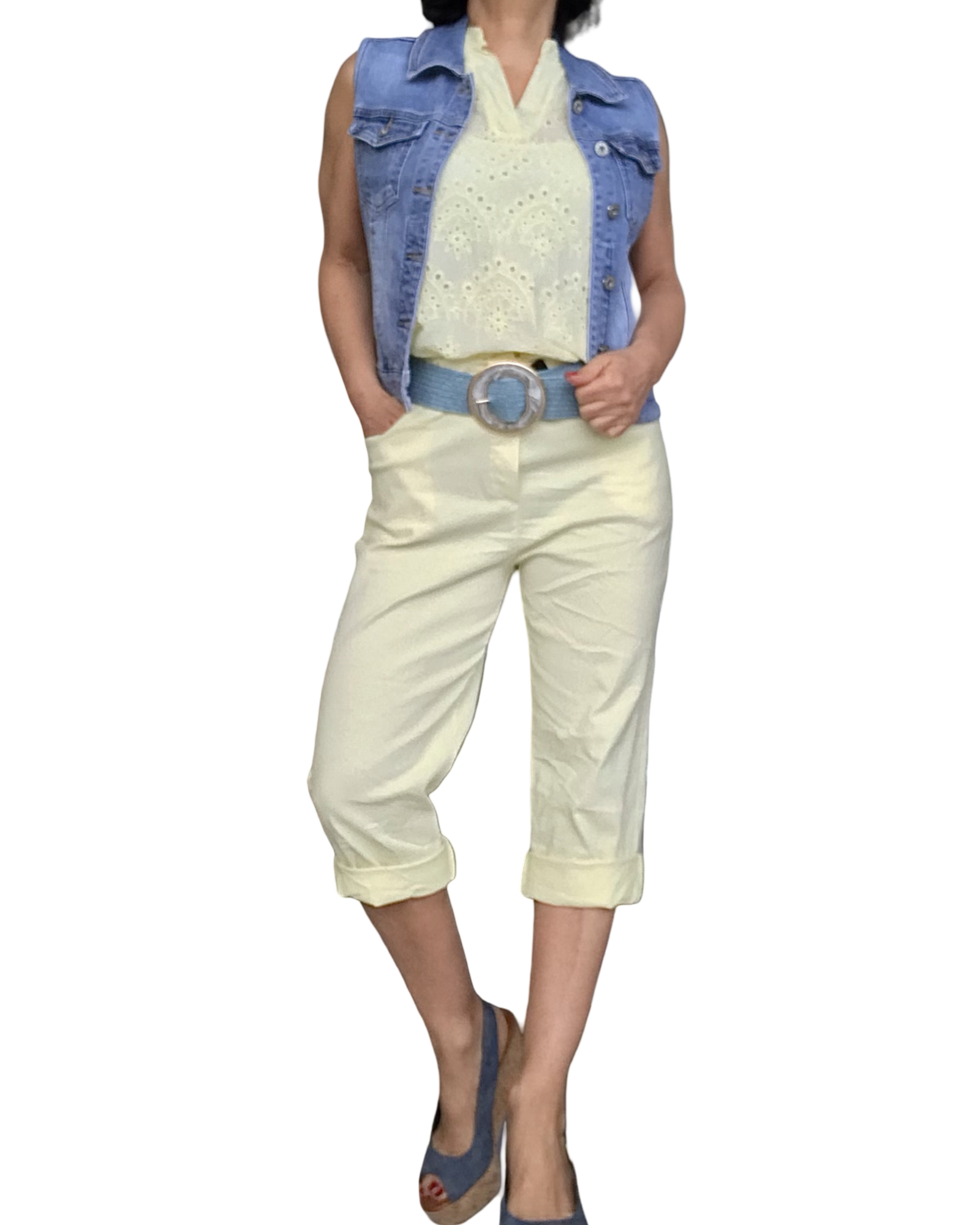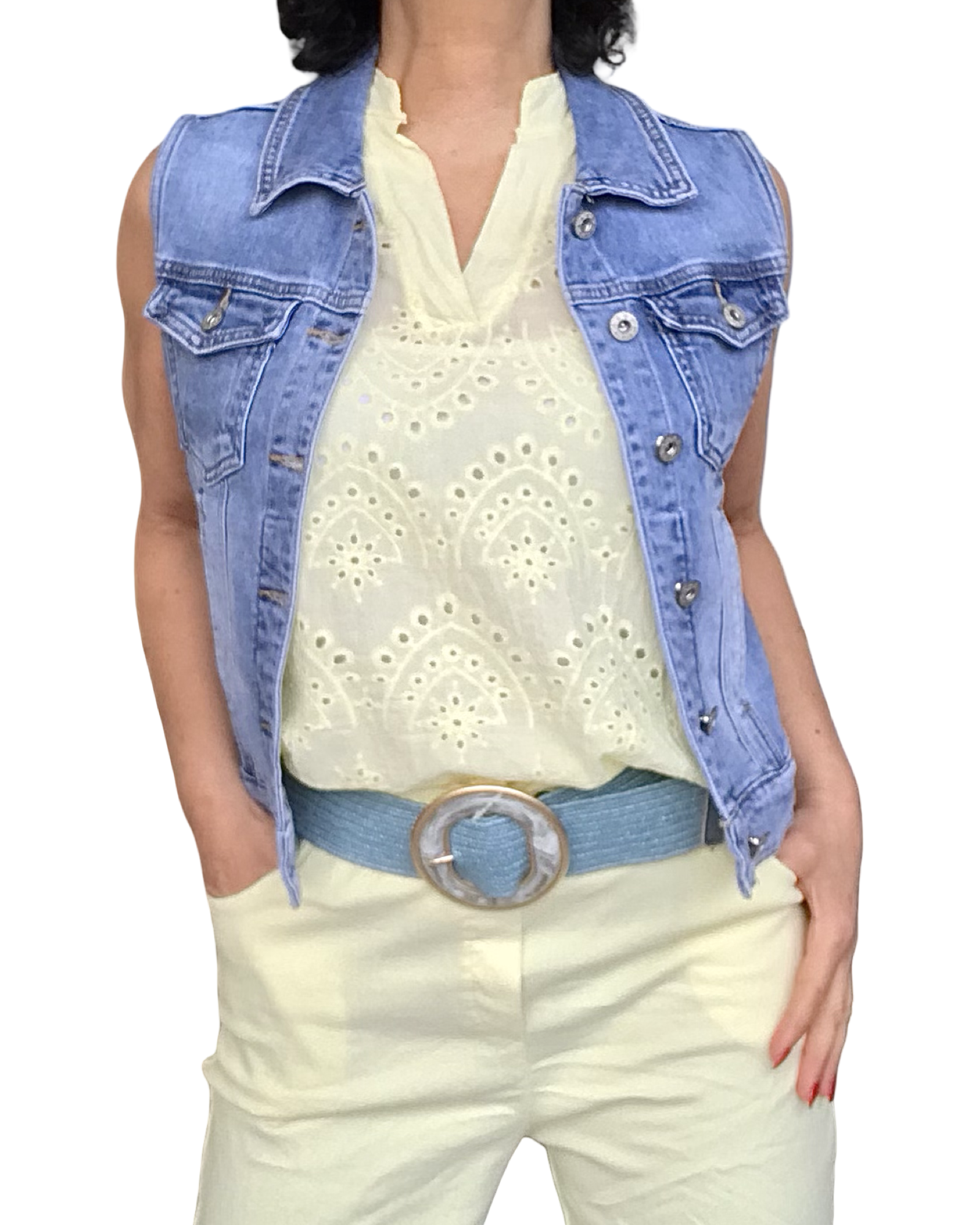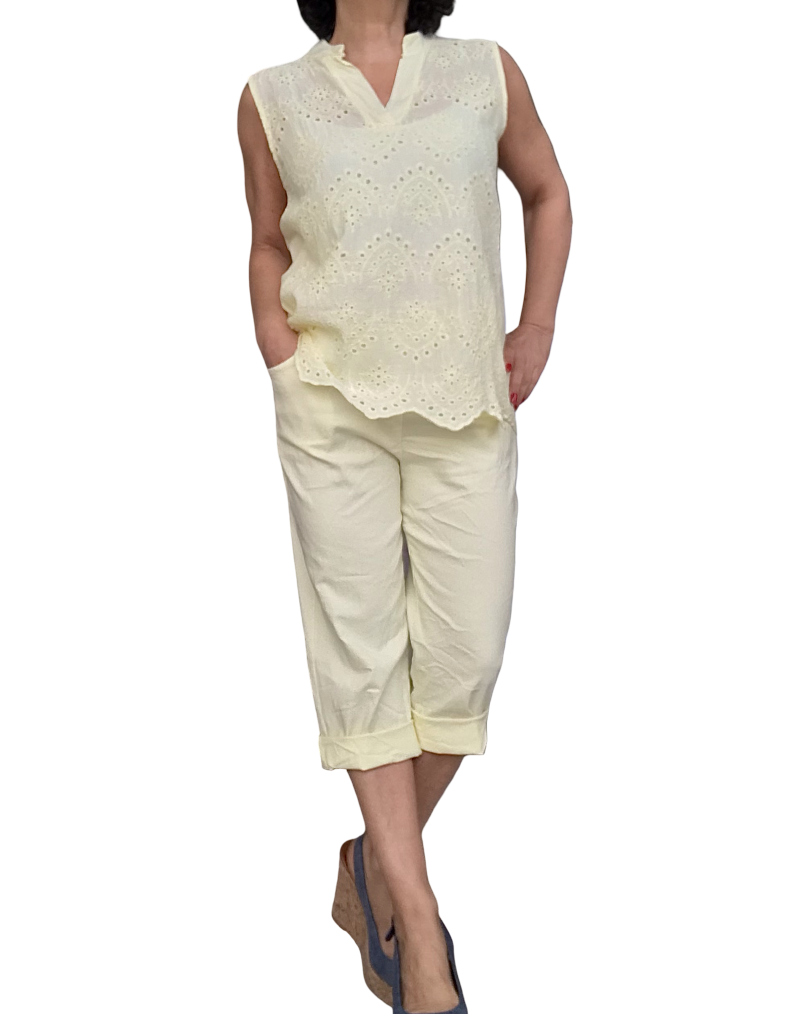 Blouse jaune pâle sans manche broderie anglaise devant