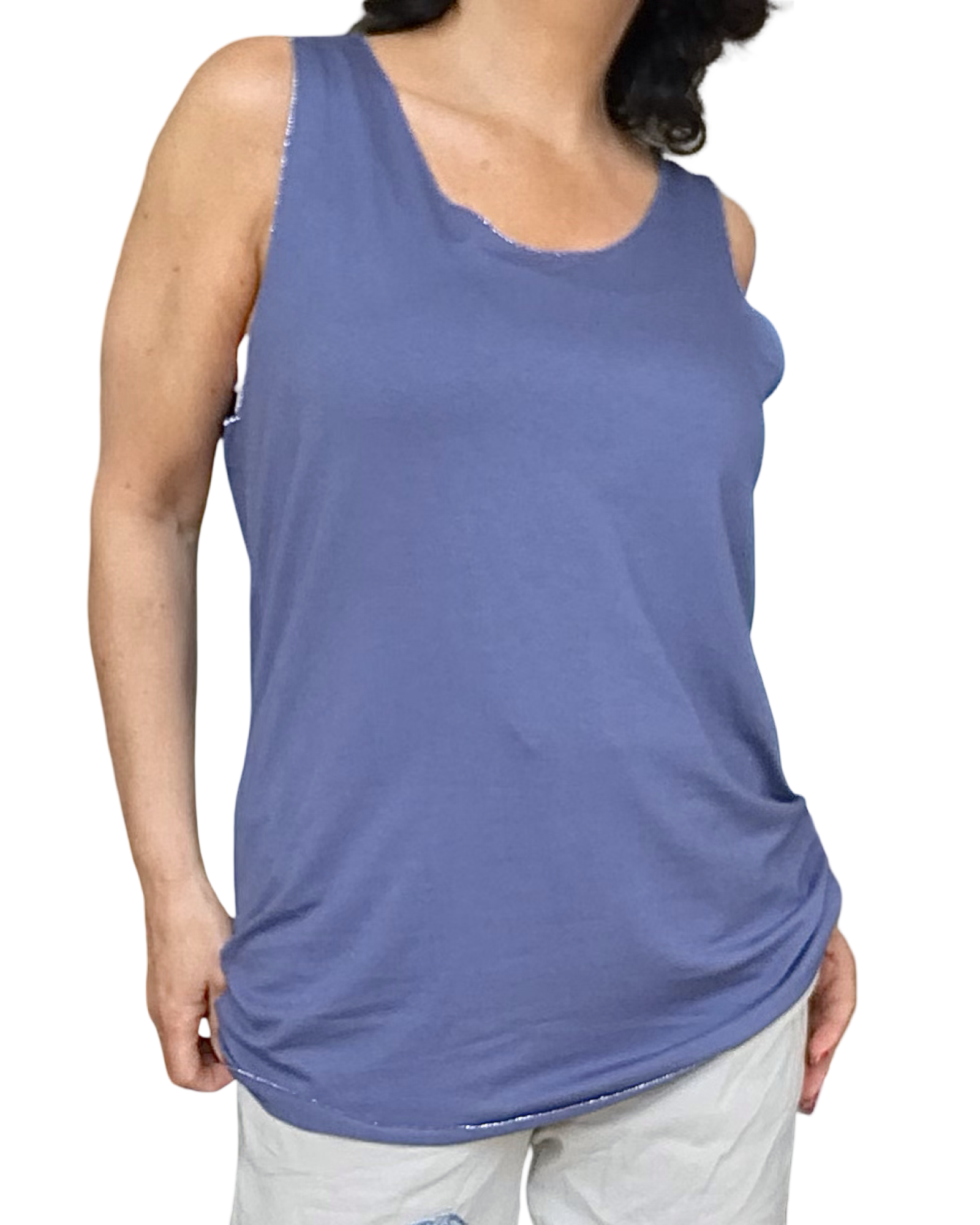 Camisole bleu jeans à bretelle large col en u. Un fil de lurex argenté garni l’encolure, les manches et le bas de la camisole. Elle a un tissu extensible et elle est très confortable.