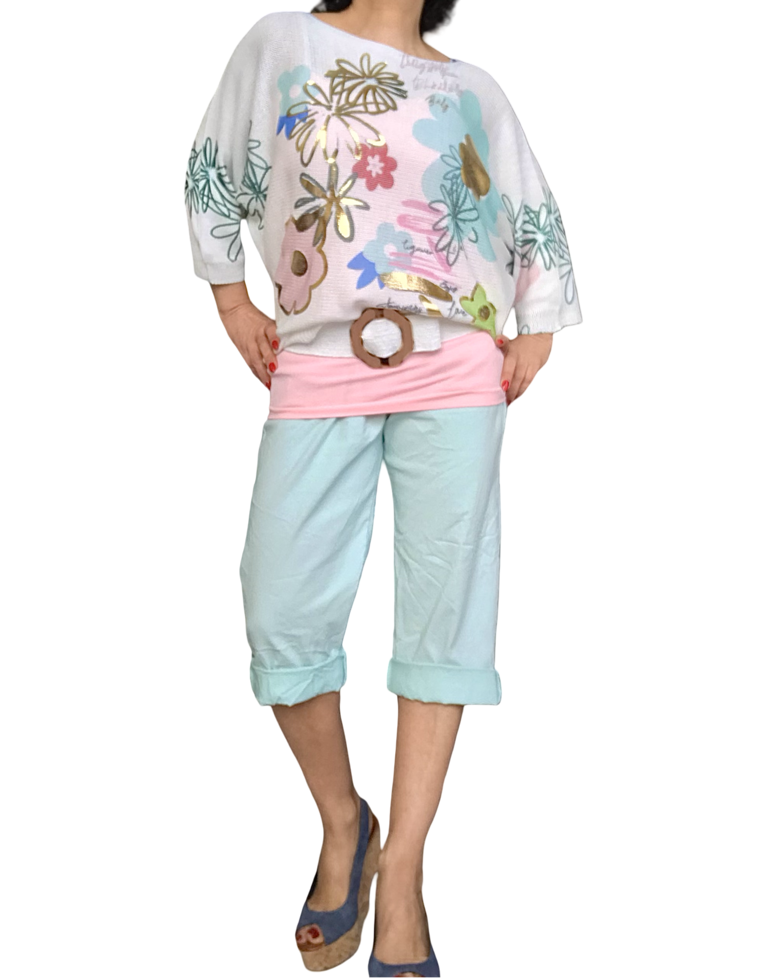 Laissez-vous charmer par ce chandail crème tricot léger imprimé fleurs aqua, rose pâle et doré 🌸 Col bateau élégant. Léger et confortable :