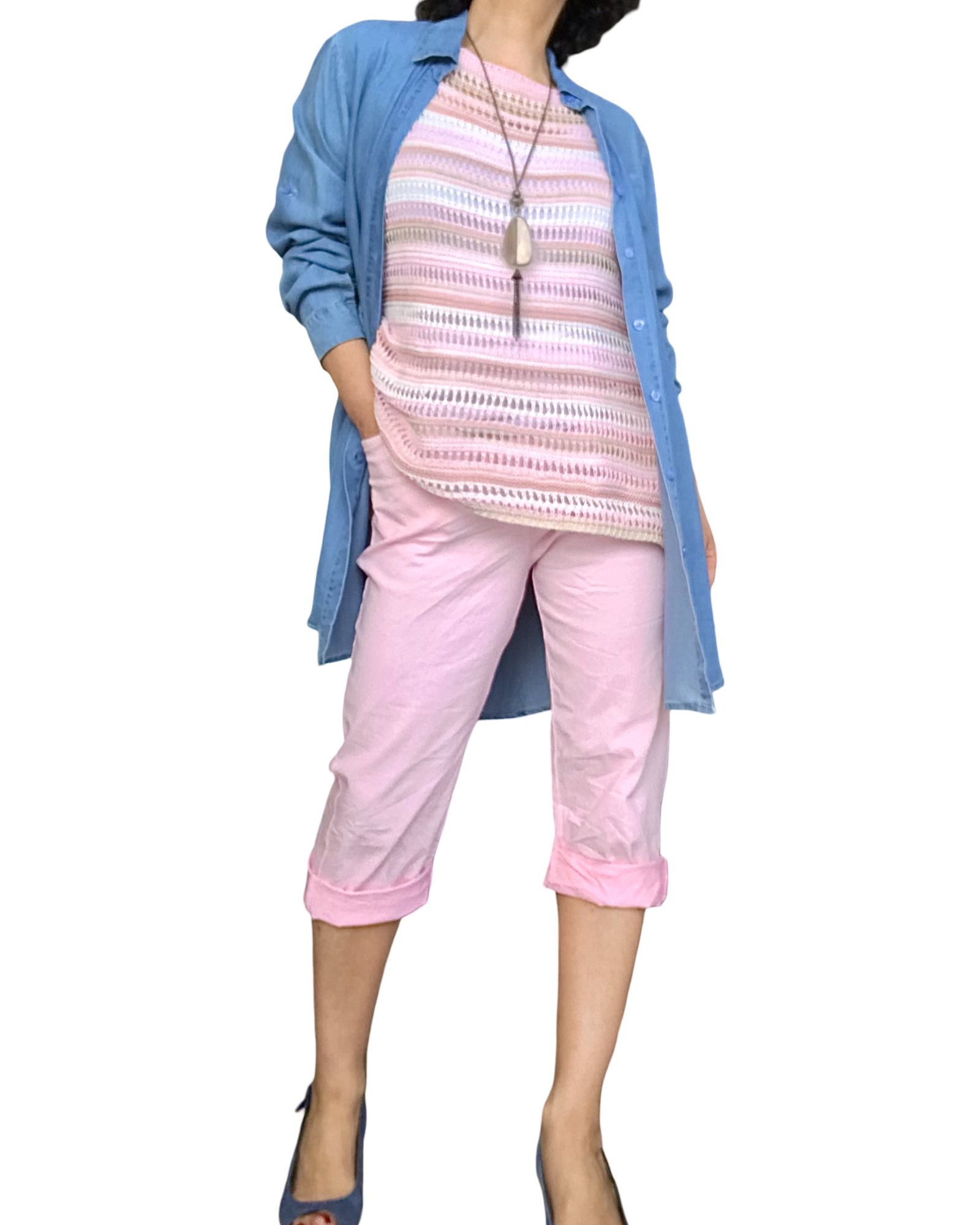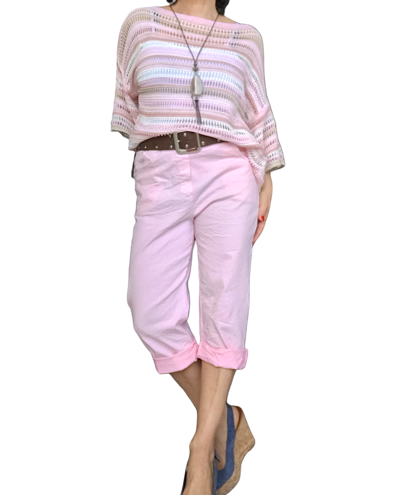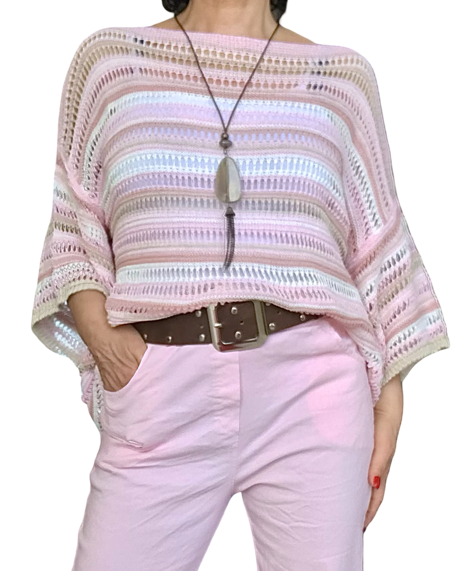 Chandail Crochet Rayures Rose Pâle Col Bateau Manches Courtes – Description du produit