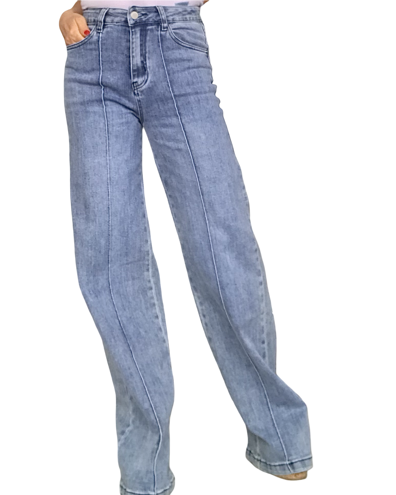 Jeans Bleu Clair Jambe Droite Surpiqûres Taille Haute – Description du produit