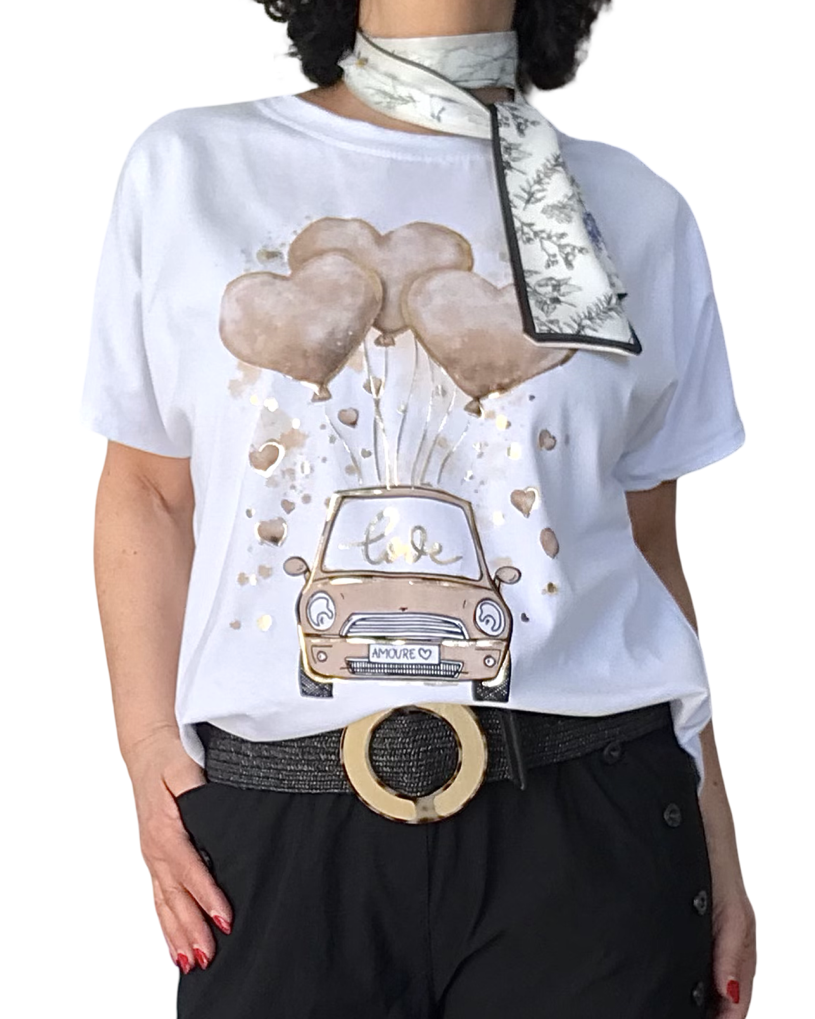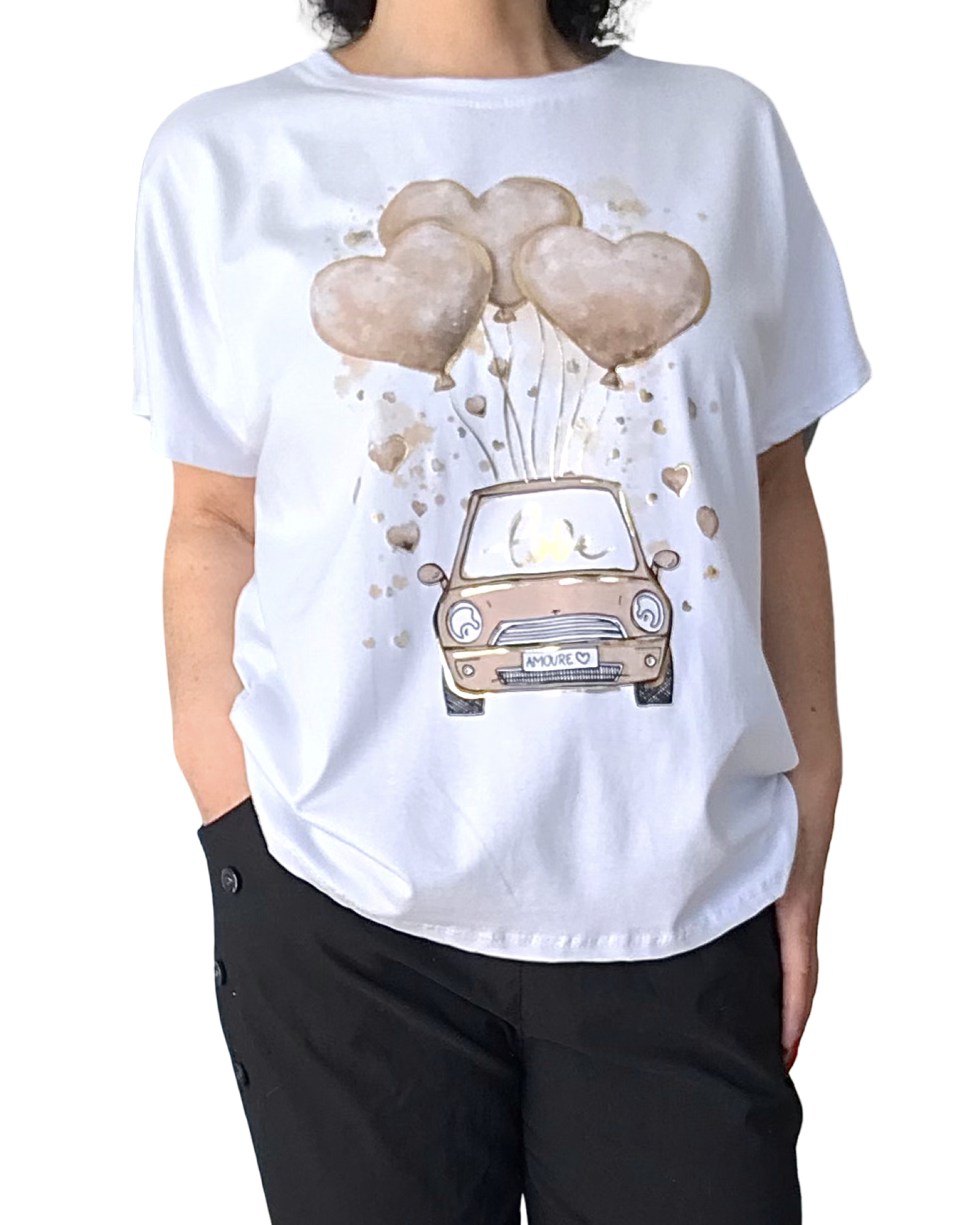 T-shirt blanc avec fiat et ballons moka en forme de cœurs