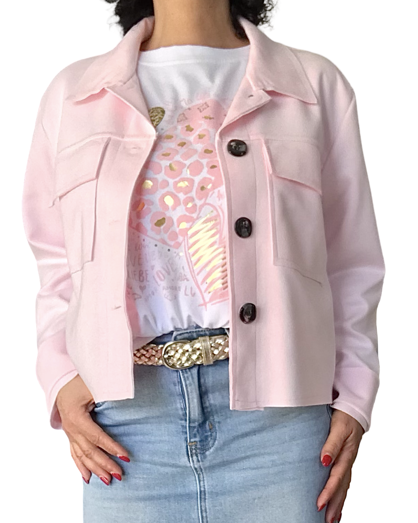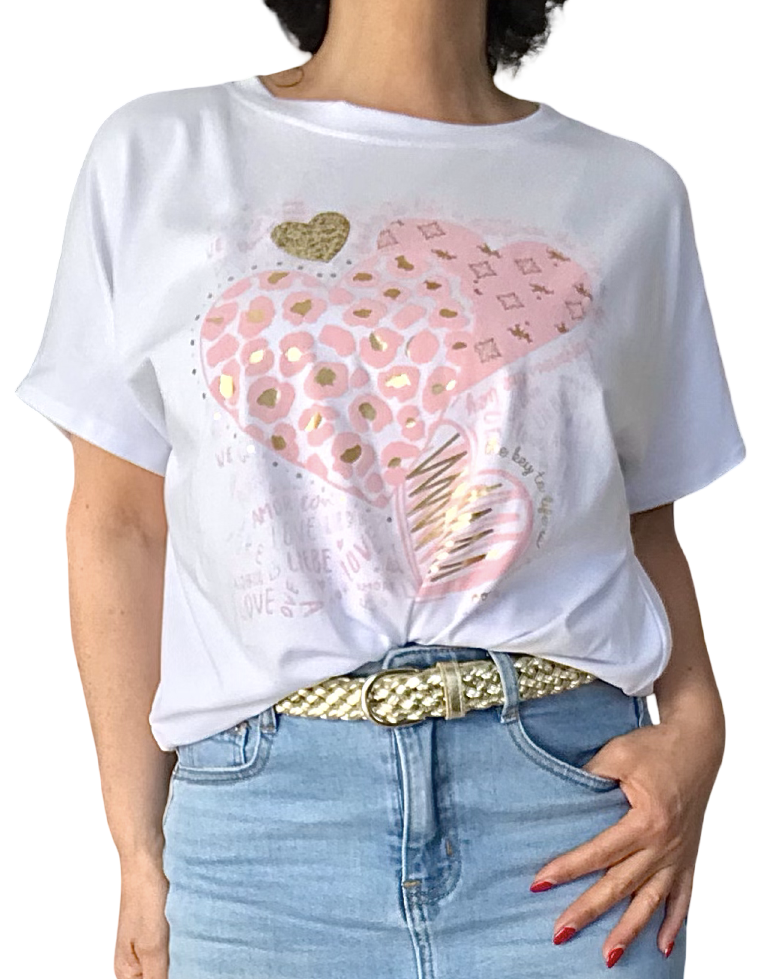 Découvrez notre T-shirt blanc avec imprimé de cœurs rose pâle et doré. Il est plus long derrière que devant et L’encolure est en rond. Des écritures rose pâle entourent les cœurs. Conçu dans un tissu doux et léger, ce modèle à manches courtes apporte un style décontracté. Il allie tendance et confort.