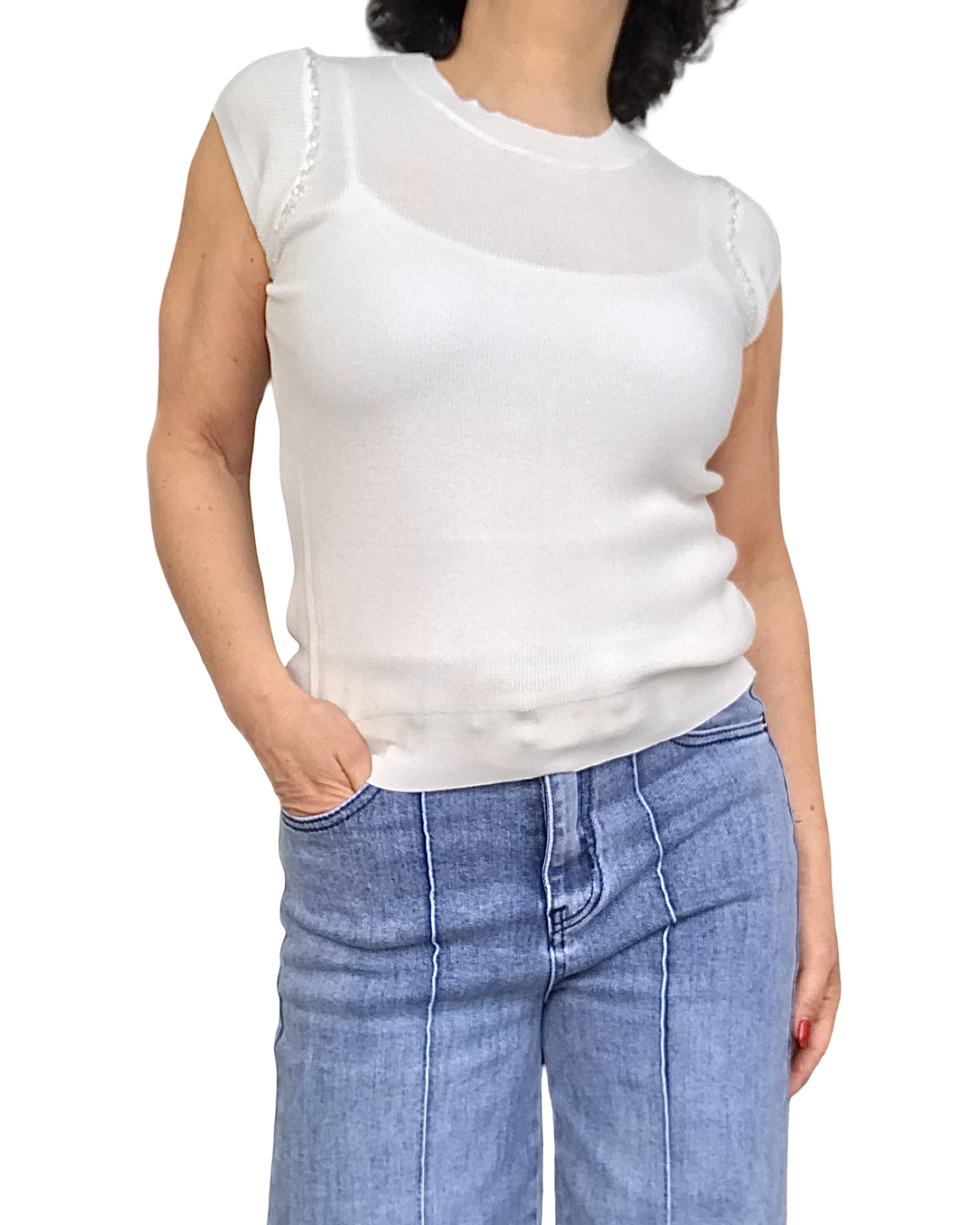 T-shirt uni blanc cassé col rond garni de pierres sur chaque épaule