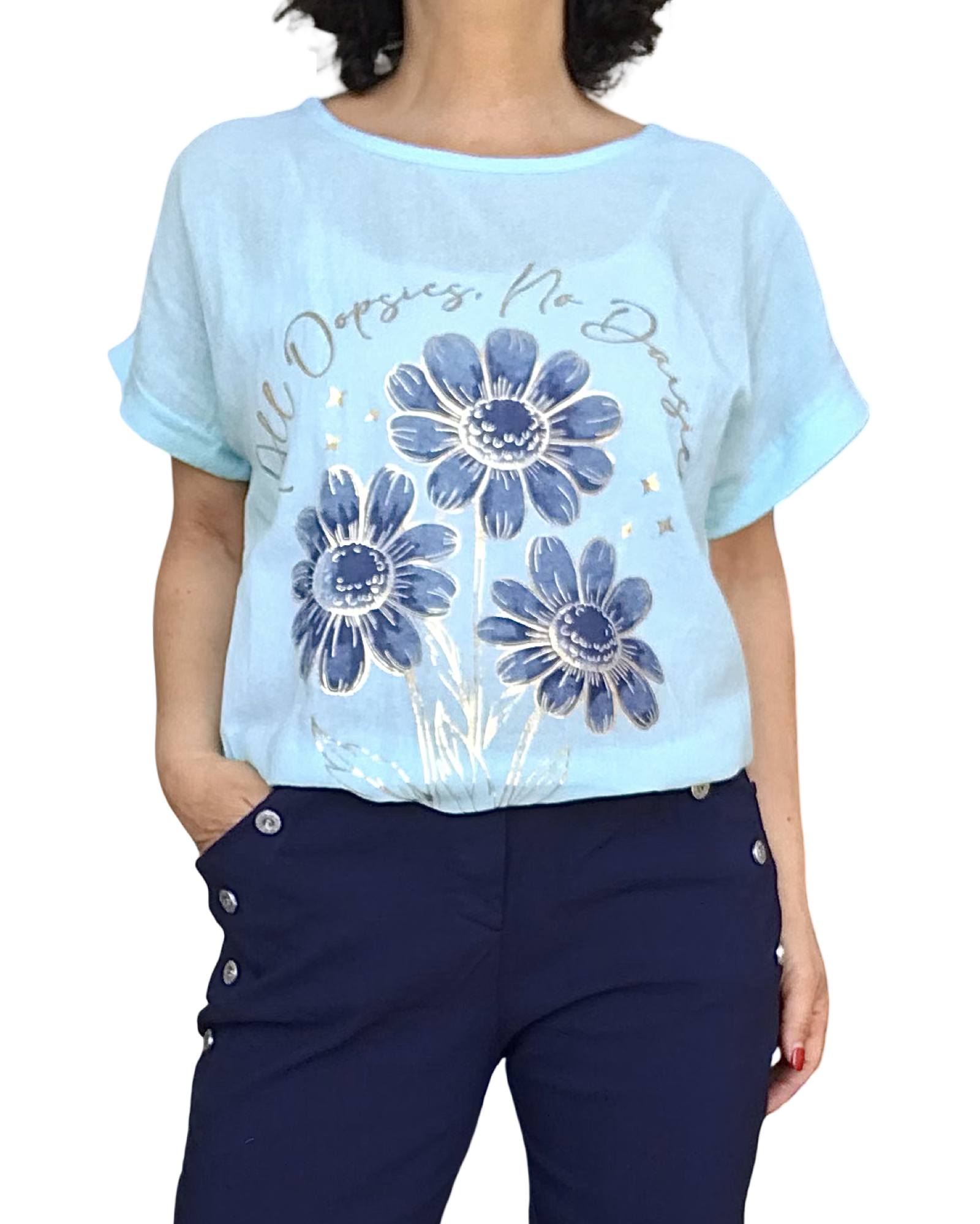Découvrez notre blouse Aqua manche courte avec 3 marguerites marines devant. Les marguerites sont surlignées de doré. La blouse est col rond et elle est nouée sur le côté au bas. Elle allie style décontracté et confort. Conçu dans un tissu léger et respirant , idéal pour la saison estivale.